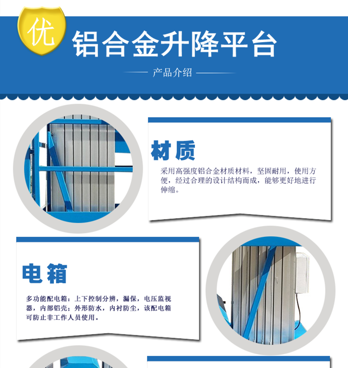 鋁合金升降平臺選材:鋁及其合金具有一系列優異特性,在金屬材料的應用中鋁材僅次于鋼鐵而居第二位。應用領域包括航天航空、軌道車輛、機械制造業、電子電器等領域。在結構、裝飾和功能方面,鋁合金型材是一種永不衰敗的材料。
